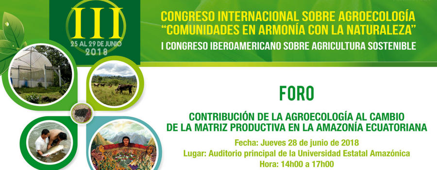La conferencia se llevará a cabo en el Foro: “Contribución de la Agroecología al cambio de la matriz productiva en la Amazonía ecuatoriana” que se realizará en el marco del “III Congreso Internacional de Agroecología: Comunidades en armonía con la naturaleza” en la Universidad Estatal Amazónica.