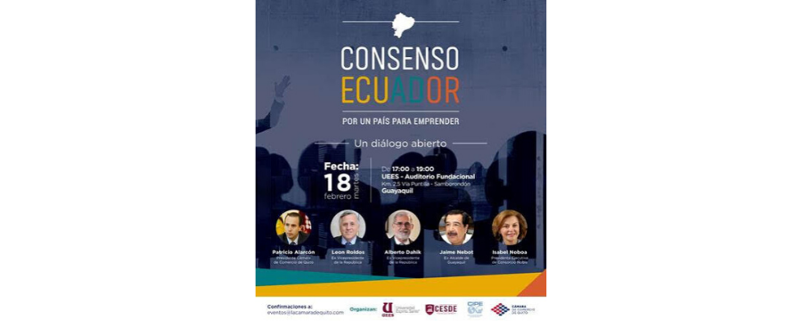 La Cámara de Comercio de Quito, como gremio productivo, dialogó con diferentes actores en el país para socializar la propuesta denominada “Consenso Ecuador”, una alternativa de modelo de desarrollo desde la mirada empresarial. El primer evento de socialización se realizó en Guayaquil, el martes 18 de febrero en el auditorio Fundacional de la Universidad de Especialidades Espíritu Santo, a las 17:00. El evento tuvo como panelistas a la empresaria Isabel Noboa, los ex vicepresidentes León Roldós, Alberto Dahik y el ex alcalde de Guayaquil, Jaime Nebot.