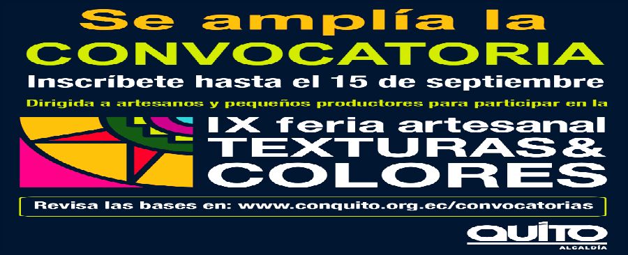 Hasta el viernes 15 de septiembre se amplía el proceso de inscripción para participar en la Feria Texturas, Colores & Sabores. La feria es organizada por la Alcaldía de Quito, mediante la Agencia de Promoción Económica ConQuito y Quito Turismo, se invita a los artesanos del Distrito Metropolitano a participar en la convocatoria. Las bases están disponibles en la página Web de ConQuito www.conquito.org.ec o en el siguiente link http://bit.ly/2wJZawW. Las personas interesadas pueden hacer llegar sus postulaciones físicas a las Administraciones Zonales de: Calderón, Los Chillos; además de a Quito Turismo y a ConQuito. También se puede hacer uso de la plataforma de Ferias de ConQuito (www.conquito.org.ec) a la dirección: http://190.11.254.146:8090/ferias/. La Feria tiene como objetivos mostrar a la ciudadanía a los mejores exponentes de productos artesanales de la ciudad, promover relaciones comerciales basadas en principios de comercio justo y generar conciencia sobre la importancia de la artesanía como identidad local y recurso para dinamizar la economía, el turismo y la cultura de Quito.