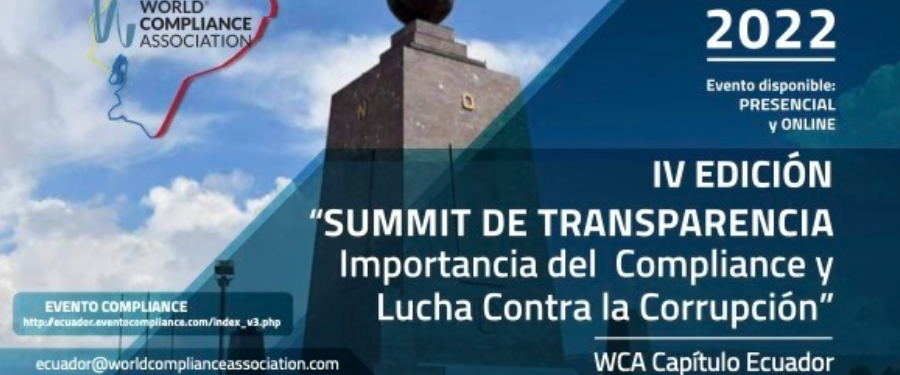 El 15, 16 y 17 de noviembre de 2022, en Quito, se realizará la 4ta Edición del Summit de Transparencia “Importancia del Compliance y Lucha contra la Corrupción”, organizada por World Compliance Association (WCA).