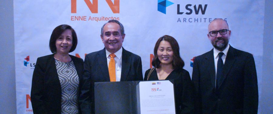 Enne Arquitectos, firma ecuatoriana pionera en el desarrollo de prácticas sustentables y LSW Architects, empresa americana líder en arquitectura sostenible, suscribieron un convenio de cooperación que busca revolucionar los procesos de construcción en el Ecuador y expandir estas tendencias a nivel internacional. El evento se llevó a cabo el 6 de abril en el hotel Dann Carlton y contó con la presencia de representantes de las cámaras, gremios de profesionales, academia y sector productivo.