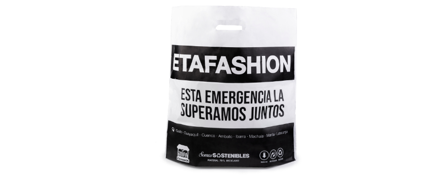 Según el INEC, entre 2014 y 2018 en Ecuador se utilizaron alrededor de 3.493.512 bolsas plásticas desechables cada año, ocasionando un daño irreparable al planeta. Por esta razón, Etafashion incorporó estas bolsas amigables con el medio ambiente como parte de su estrategia de responsabilidad social para eliminar de manera progresiva y definitiva el uso de fundas plásticas en el país.