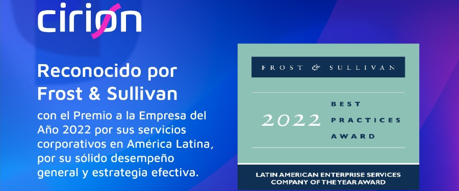 Frost & Sullivan distinguió a Cirion Technologies con su prestigioso Premio a la Empresa del Año por sus servicios corporativos en América Latina, reconociendo a Cirion por su sólido desempeño general y estrategia efectiva.