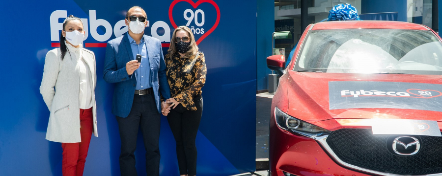 Fybeca cumple 90 años de trayectoria al servicio y cuidado del bienestar de la comunidad, y lo celebra junto a sus clientes con la entrega de un auto 0Km cada mes. Entre las personas que realizaron sus compras en la cadena de farmacias Fybeca a nivel nacional en octubre, noviembre y continúen haciéndolo durante diciembre, acceden a un cupón para participar en el sorteo de un auto Mazda CX-5.