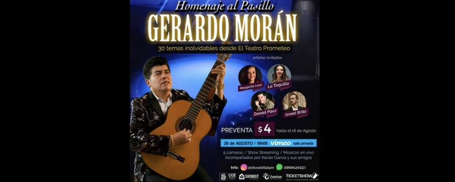 Showbit Content House en coproducción con la Casa de la Cultura Ecuatoriana Benjamín Carrión, presentan en agosto un espectáculo online para homenajear al género musical del Pasillo, declarado como Patrimonio Cultural Nacional Inmaterial de nuestro país. En este marco el productor musical ecuatoriano, Gerardo Morán, interpretará en vivo una selección de 30 pasillos inolvidables.