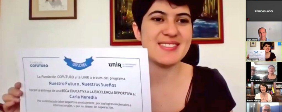 La Fundación Cofuturo, entidad vinculada a la Universidad Internacional de La Rioja (UNIR), ha entregado una beca educativa de excelencia deportiva a la ajedrecista Carla Heredia, dentro del programa ‘Nuestro Futuro, Nuestros Sueños’. La iniciativa busca reconocer, a través de becas del 100% para pregrado y posgrado de UNIR, a los mejores deportistas de élite ecuatorianos. El objetivo es fortalecer su formación y otorgarles una nueva oportunidad de una profesión y alternativas de vida, tras finalizar sus carreras deportivas.