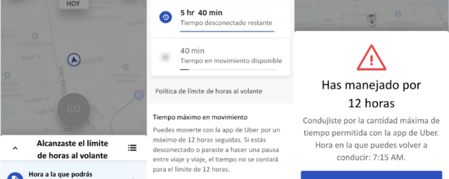 La función mostrará y contará el tiempo de conexión lo que facilita que los socios conductores estén al tanto de cuánto tiempo han estado conduciendo con la app de Uber. También se proporcionarán notificaciones periódicas cuando la cuenta se acerque al límite de tiempo de conexión de 12 horas y posteriormente se desconecta automáticamente durante seis horas seguidas cuando la cuenta alcance el tiempo máximo. Después de las seis horas desconectado, la cuenta del socio conductor estará habilitada para volver a recibir solicitudes de viaje.