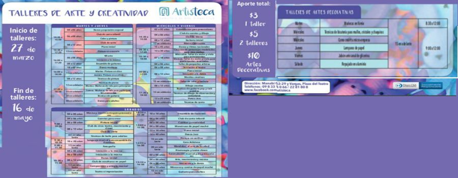 La Artisteca, Semillero de Arte de Diners Club del Ecuador, pone a disposición del público, de toda edad, su nuevo ciclo de talleres de arte. Aún está en proceso de inscripciones para el segundo ciclo de talleres, que durará del martes 27 de marzo al sábado 19 de mayo. Las inscripciones estarán abiertas hasta el sábado 7 de abril con cupos limitados. Los horarios de los talleres son de martes a viernes de 14:30 a 19:00 y los sábados de 09:00 a 17:00, con el fin de que el público al que van dirigidos puedan asistir de acuerdo a sus horarios de disponibilidad. La persona interesada deberá pagar por un taller $ 3,00 ó si opta por dos, un costo de $ 5,00 y los talleres de artes decorativas tienen un valor de inscripción de $ 10,00. Todos los talleres incluyen los materiales que se va a utilizar para su aprendizaje.