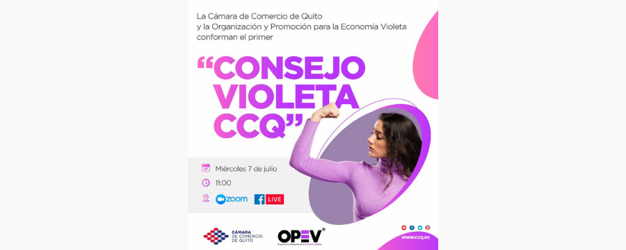 La Cámara de Comercio de Quito, en alianza con OPEV® Organización y Promoción de la Economía Violeta, conforman el primer Consejo Violeta gremial, con el fin de generar iniciativas y proyectos permanentes que apunten a reducir las brechas de género en el Ecuador. Entre las primeras acciones impulsadas de manera conjunta se encuentran: