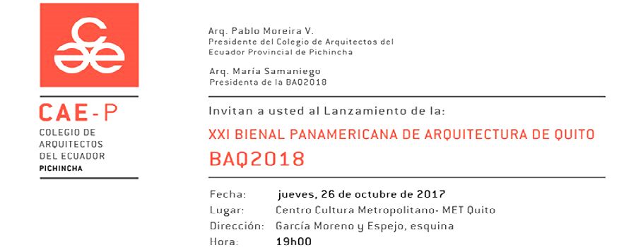 Colegio de Arquitectos del Ecuador Provincial de Pichincha y de la Comisión de la Bienal Panamericana de Arquitectura de Quito, realizaron un evento internacional catalogado como uno de los más importantes y representativos en Latinoamérica y que, en el 2018 cumple 40 años en conjunto con su ciudad sede, Quito, que también conmemora 40 años de su declaratoria como Patrimonio Cultural de la Humanidad. El evento de lanzamiento de la XXI edición de la Bienal Panamericana de Arquitectura de Quito, XXI BAQ2018 se realizará el próximo 26 de octubre de 2017 en el Centro Cultural Metropolitano entre la García Moreno y Espejo, esquina a las 19:00 (Quito).