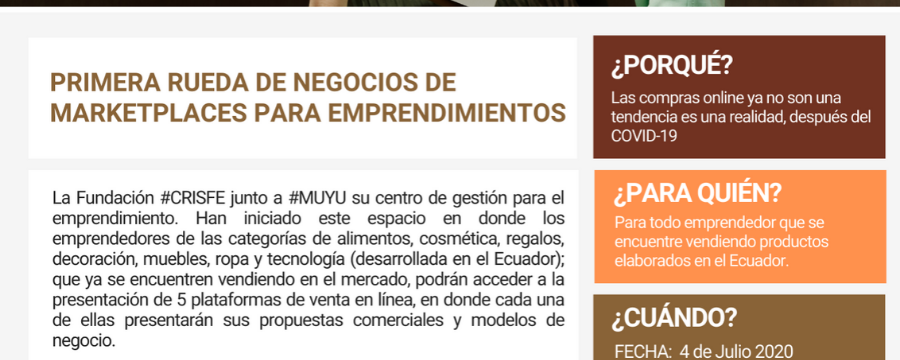 La Fundación #CRISFE junto a #MUYU han iniciado este espacio en donde los emprendedores de las categorías de alimentos, cosmética, regalos, decoración, muebles, ropa y tecnología (desarrollada en el Ecuador); que ya se encuentren vendiendo en el mercado, podrán acceder a la presentación de 5 plataformas de venta en línea, en donde cada una de ellas presentarán sus propuestas comerciales y modelos de negocio.