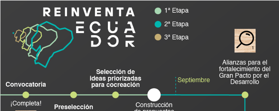 Luego de un proceso de casi tres meses, en donde la ciudadanía remitió ideas para impulsar la economía del país y un equipo técnico y de jurados evaluó cada una de las postulaciones; Reinventa Ecuador pasa a una segunda etapa, denominada de Construcción y Cocreación. De acuerdo a sus organizadores, la Alianza para el Emprendimiento e Innovación (AEI) y Naciones Unidas Ecuador, a partir del 7 de septiembre inicia esta segunda etapa, en donde principalmente se pretende impulsar los sectores económicos que se definieron, a partir de las 49 ideas preseleccionadas por un equipo de evaluadores ý expertos en materia económica, productiva, legal, ecosistema emprendimiento e innovación y objetivos de desarrollo sostenible.