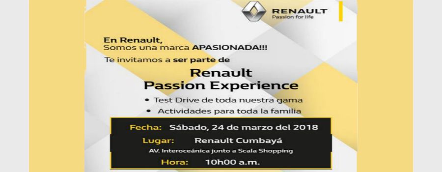 La marca automotriz francesa Renault te invita al evento: “Renault Passion Experience”, que se realizará este sábado 24 de marzo a las 10:00, en el concesionario de Cumbayá, ubicado en la Av. Interoceánica junto al Scala Shopping. Este encuentro tiene la finalidad de que vivas una gran experiencia, sintiendo la adrenalina al manejar la amplia gama de modelos de la marca y a su vez descubriendo toda la innovación de cada automóvil. Además estarán presentes Pilotos especializados, junto a Técnicos ITF quienes comentarán en detalle las partes técnicas de cada auto (Logan, Duster, Sandero, Stepway, twizy) y donde también se contará con un área Renault kids para niños, dado que este es un evento con actividades para toda la familia.