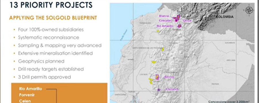 SolGold opera múltiples equipos de campo regionales que están explorando y evaluando 75 concesiones regionales en 14 provincias de Ecuador. Hasta la fecha, sus geólogos han identificado 13 objetivos prioritarios en diversas regiones del país y sus voceros señalan que la compañía aspira a convertirse en una empresa productora de cobre y oro de nivel mundial.