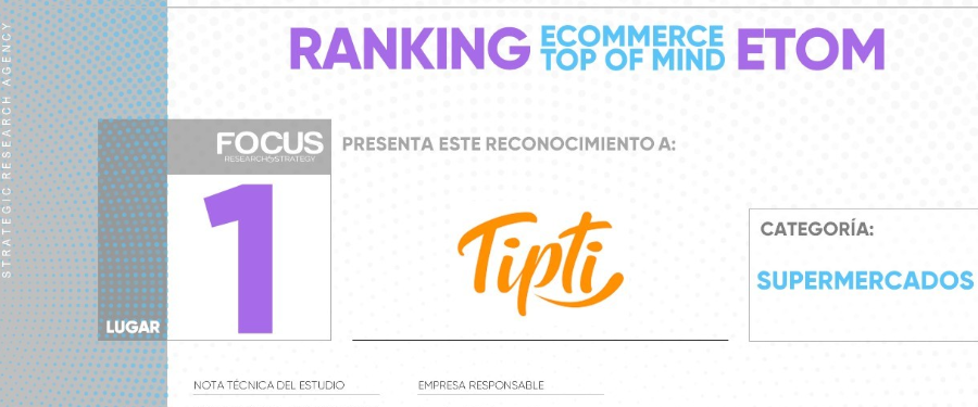 Tipti (Tiempo para Ti), el asistente virtual de compras de supermercado y tiendas especializadas, recibió el reconocimiento como la aplicación número 1 en Ecuador, en la categoría de Supermercados y Alimentos para el hogar, en la segunda edición del Ecommerce Top of Mind, realizada por Focus Research&Strategy, empresa que se dedica a la investigación de mercados en el país, cuyo estudio del 2022 fue presentado en noviembre.