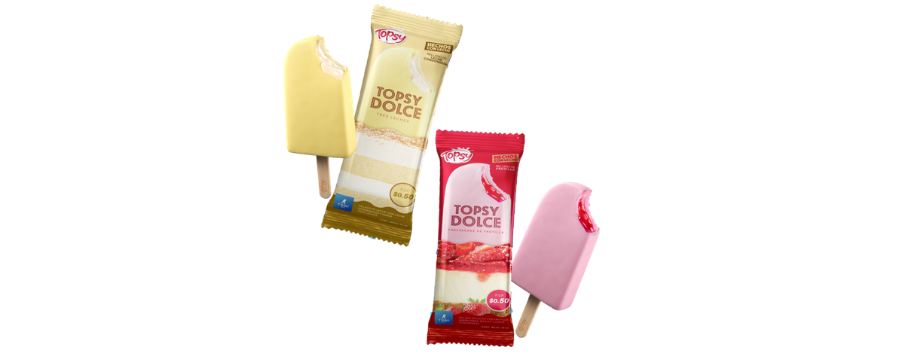 Topsy presenta su más reciente innovación al mercado ecuatoriano, Topsy Dolce en 2 sabores, postres del gusto de los ecuatorianos: Tres leches con un centro líquido de leche condensada y cheescake con centro líquido de mermelada de frutilla. Topsy Dolce reinventa la manera de comer un postre, ya que es una opción ideal y conveniente para consumir en cualquier momento y convertirlo en una ocasión especial satisfaciendo el antojo de un delicioso postre.