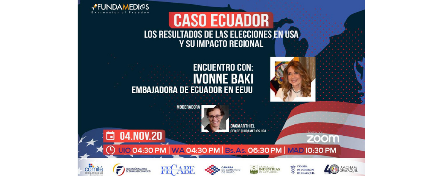 La embajadora de Estados Unidos, Ivonne Baki, analizará el 4 de noviembre los resultados de las elecciones presidenciales en Estados Unidos y su impacto regional, con foco en Ecuador. Será un conversatorio digital convocado por Fundamedios, a las 16:30 horas, y que estará bajo la moderación de Dagmar Thiel, CEO de la organización en Estados Unidos.