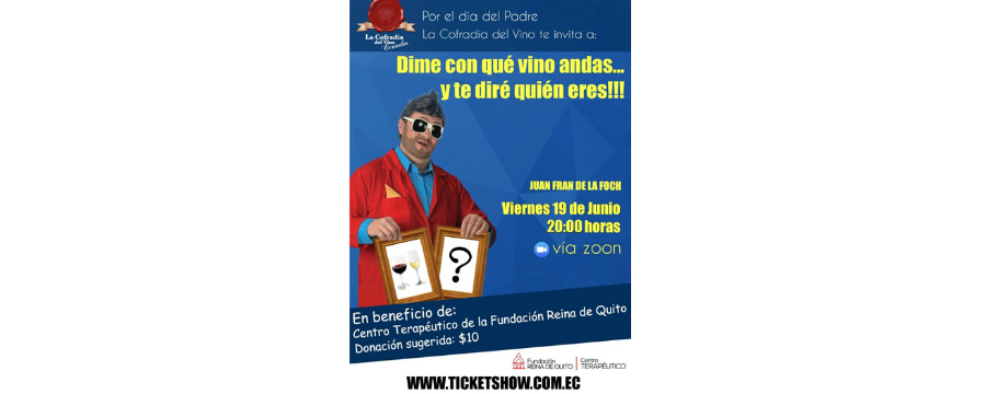 La Confradía del Vino Ecuador trae a la pantalla de todos, el espectacular monólogo “Dime con que vino andas… y te diré quién eres!!!” del reconocido comediante Juan Fran de la Foch en beneficio de niños y jóvenes con Síndrome de Down del centro terapéutico de la Fundación Reina de Quito. El show dirigido al público adulto tendrá lugar el próximo viernes 19 de junio a partir de las 20h00 a través de la plataforma de zoom con motivo del Día del Padre, la representación pondrá a prueba el glamour y la etiqueta de los cofrades a través del vinómetro de Juan Fran de Foch en una noche que sin duda será llena de diversión y sorpresas. Las personas interesadas pueden adquirir sus entradas en ticketshow www.ticketshow.com.ec, con una contribución sugerida de 10 dólares, regalando a papá un momento increíble de total diversión y ayudando a los pequeños angelitos que necesitan de una mano amiga para continuar con su tratamiento.