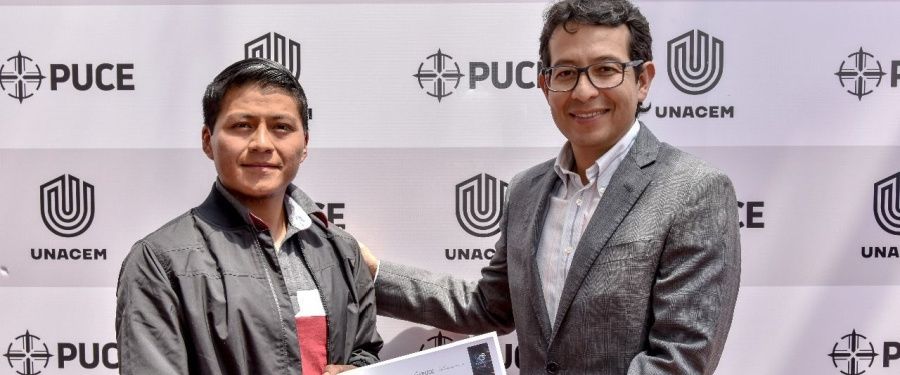 Durante la firma del convenio, UNACEM Ecuador entregó a su estudiante más destacado de la Escuela de Formación Selvalegre, una beca completa para cursar la “Tecnología Superior en Construcción”, impartida en la PUCE, cuyo objetivo es incidir en la profesionalización de los obreros del sector de la construcción.