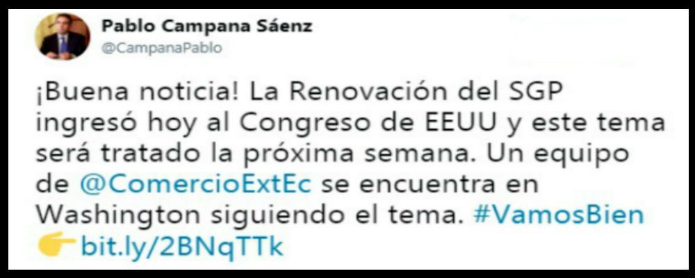 La Renovación del Sistema Generalizado de Preferencias (SGP), que permitirá la entrada de productos ecuatorianos a ese mercado sin pagar aranceles, ingresó el jueves, 8 de febrero del 2018, al Congreso de EE.UU., según un comunicado emitido por la Casa Blanca. La legislación bipartidista presentada proporciona una renovación de tres años del SGP, un programa de preferencia comercial de larga data de los Estados Unidos, “que ofrece alivio arancelario y ahorro de costos para empresas, trabajadores y consumidores estadounidenses en todo el país”. El sistema, del cual son parte Ecuador y otros 127 países en vías de desarrollo, feneció el pasado 31 de diciembre. Fuente: El Comercio.
