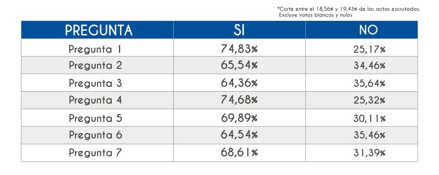 Las siete preguntas superaron el 60 por ciento de aprobación ciudadana, según un primer conteo rápido difundido por el Consejo Nacional Electoral (CNE), siendo la primera y la cuarta las que más apoyo recibieron, con 74,83 y 74,68 por ciento, respectivamente.