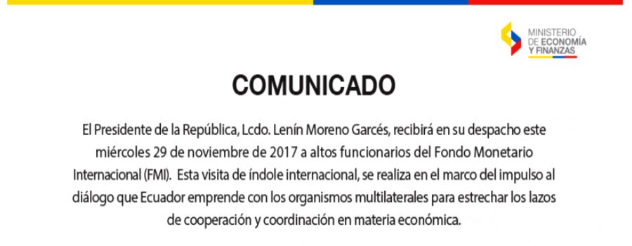 El Ministerio de Economía y Finanzas, a través de un boletín oficial, informó que el miércoles 29 de noviembre el presidente Lenín Moreno recibirá "a altos funcionarios del Fondo Monetario …