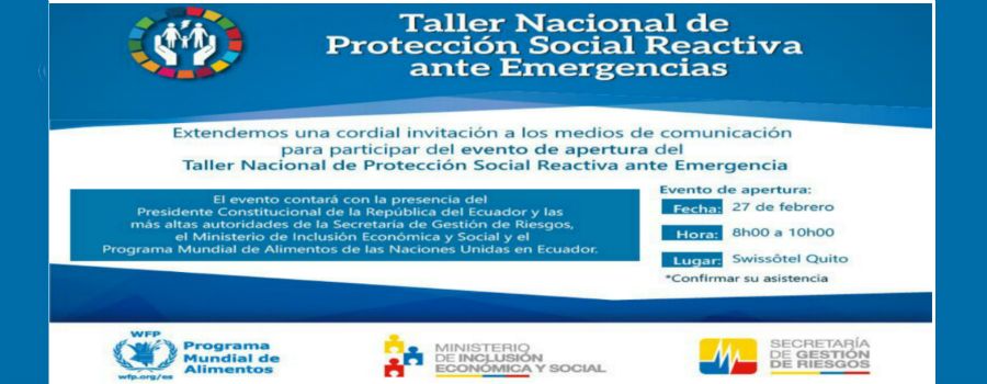 Taller Nacional de Protección Social Reactiva ante Emergencias, extendiende una invitación al público al evento de apertura del Taller a realizarse en el Swisshotel de Quito, el 27 de febrero a las …