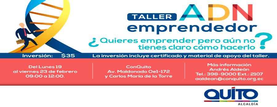 La Agencia de Promoción Económica ConQuito mediante el área de Emprendimiento e Innovación invita a participar del taller ‘ADN Emprendedor’, que se realizará desde el lunes 19 al viernes 23 de …