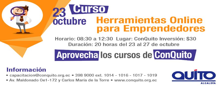 El Municipio del Distrito Metropolitano de Quito mediante la Agencia de Promoción Económica ConQuito, invita a participar del curso ‘Herramientas online para emprendedores’, el que se realizará desde …